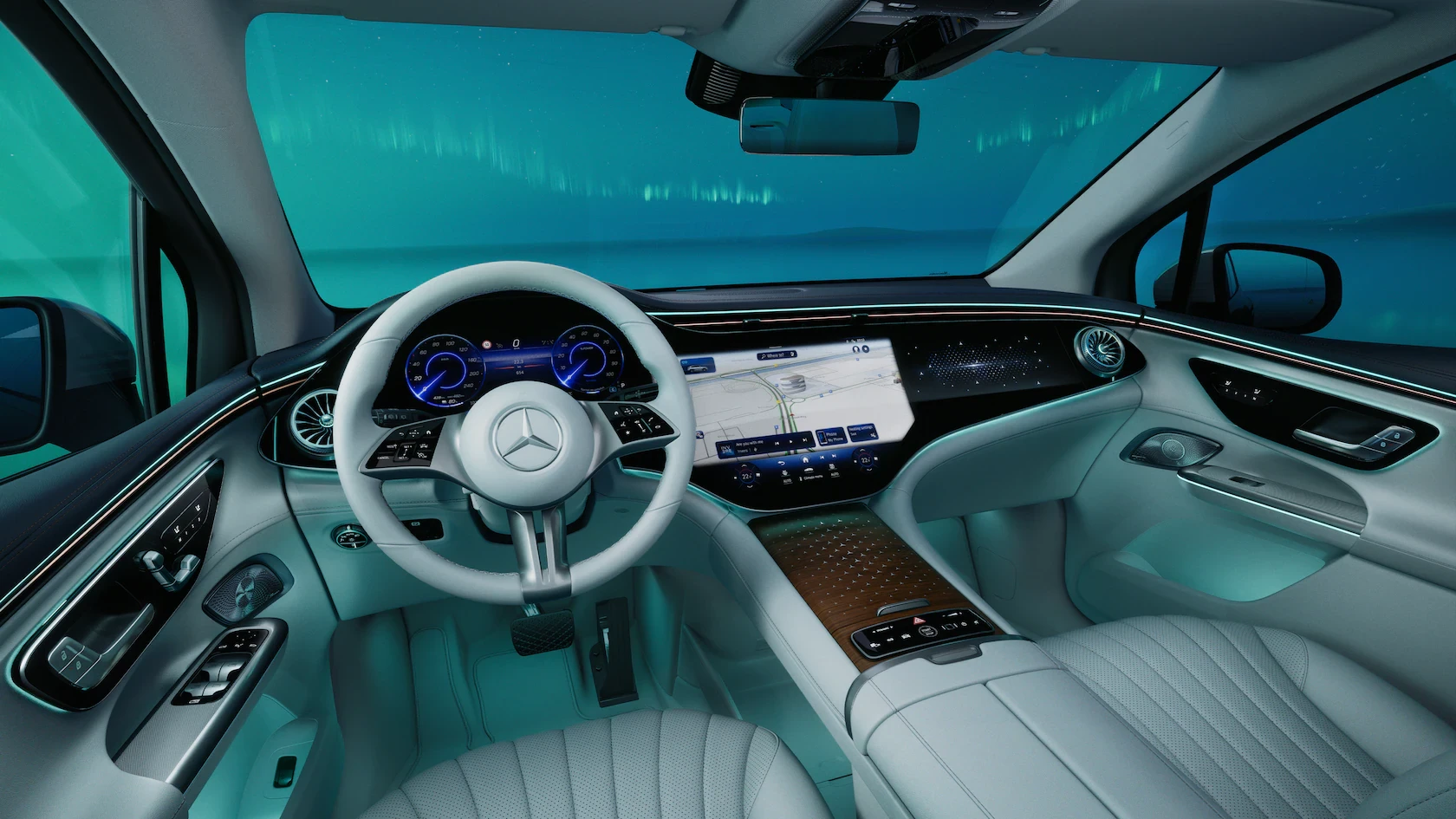 Sự kết hợp hài hoà giữa các mảng màu đơn sắc tạo nên không gian rộng rãi và thoải mái. EQE SUV chứa đựng thế giới màu sắc đầy cấp tiến với sắc thái từ ấm áp đến mát mẻ, cộng hưởng cùng ốp nội thất mở ra không gian thẩm mỹ tinh xảo.